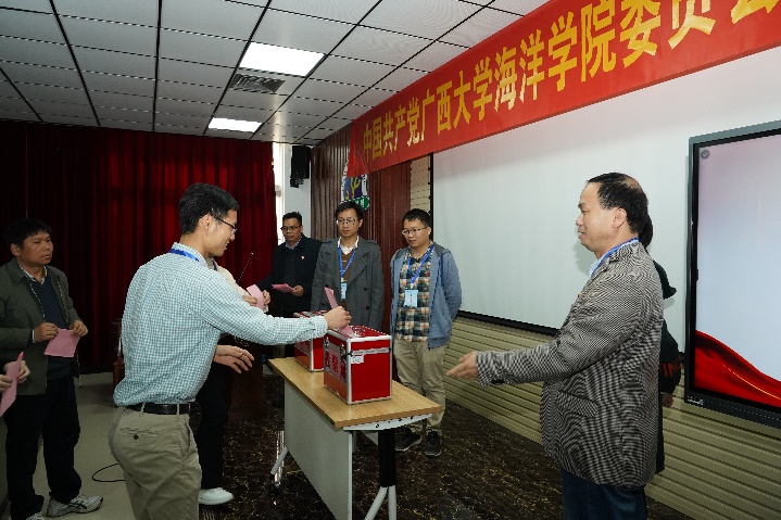 本次大会应到有选举权的正式党员67名,因病、因事请假3名,实到会正式党员64名,符合规定人数。大会先以举手表决的方式通过了《大会选举办法》和总监票人、监票人名单,然后酝酿讨论并通过了海洋公司党委委员、纪委委员候选人名单,最后以无记名投票方式差额选举产生了新一届海洋公司党委委员和纪委委员。党委委员分别是朱迅成、林玉华(女,瑶族)、姜伟、梁甲元、谭运阳;纪委委员分别是王瑞、朱迅成、周剑。
