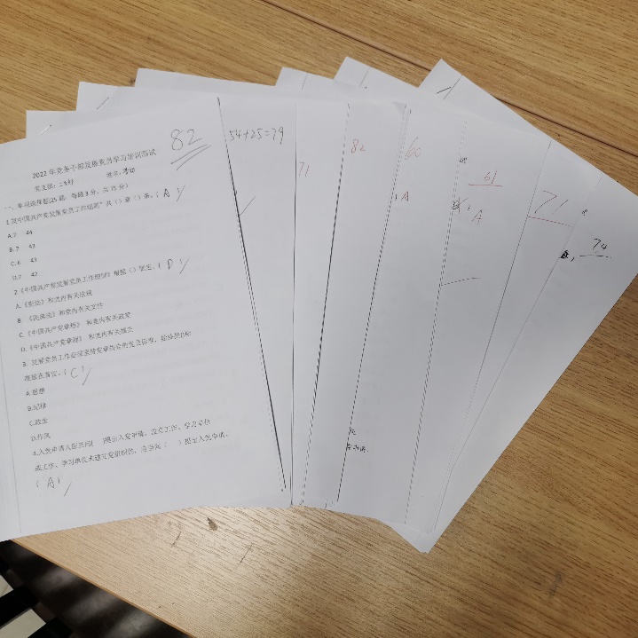 为保证培训效果,达到“以考促学、以考促行”的目的,在理论知识培训后,全体参会人员当场采取限时、闭卷的形式进行了党员发展工作测试。大家严格遵守纪律,认真答题,答题结束后采取交叉互改的方式当场改出成绩。通过这种从严从实的检验方式,倒逼党务工作者将党员发展应知应会知识入脑入心。此次测试检验了大家对党员发展应知应会知识的掌握程度,有助于查缺补漏、找准短板,提高学习的针对性。