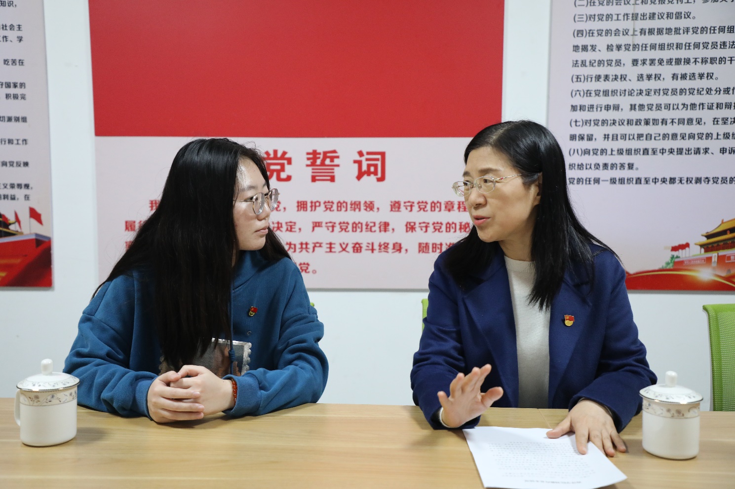 金顺南副书记(右)与刘雅玲同学(左)亲切交谈