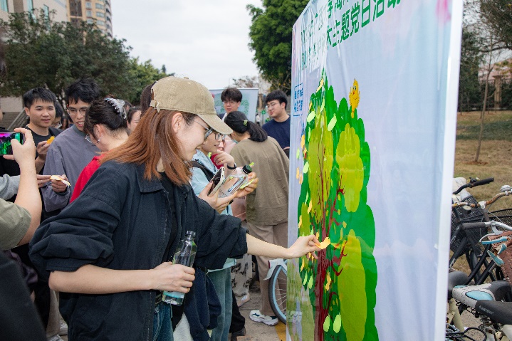 养护工作结束后,现场的植树节有奖互动答题活动将活动氛围推向高潮。大家通过抽取主题展板上的植树节相关题目进行答题,答对的可以获得植树节徽章一枚。答题活动热烈而有趣,吸引了校园里的师生,大家一起通过答题活动,进一步增强了对植树节和树木养护知识的了解。