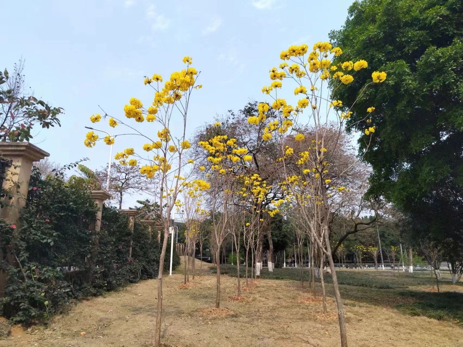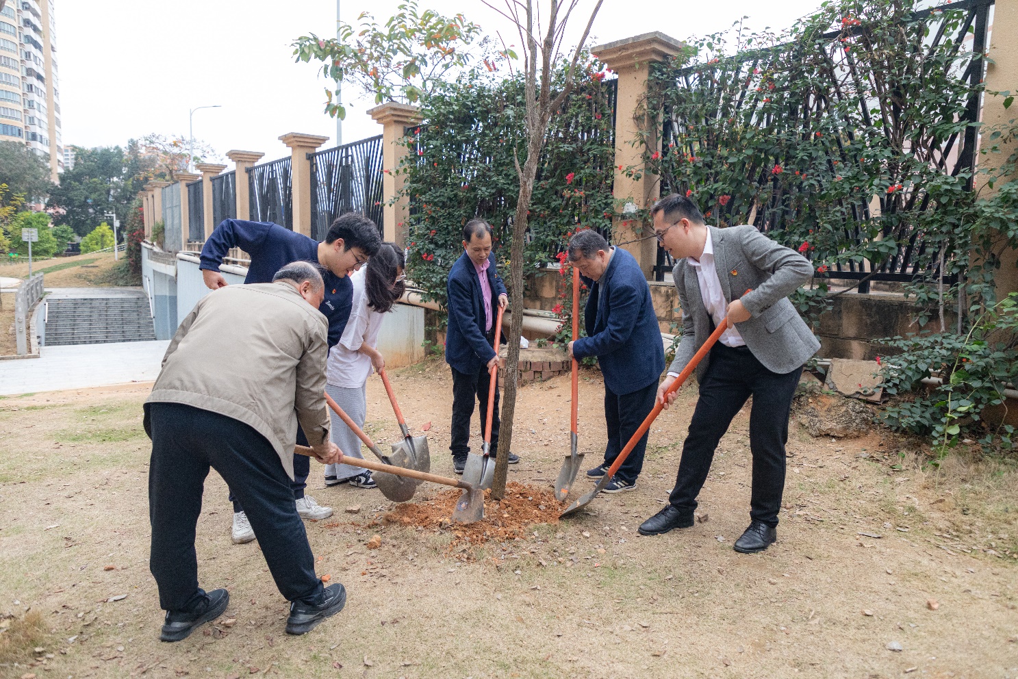培训结束后,党员同志们分组领取锄头铁铲等工具,迅速投入植树活动中。大家分工明确、配合默契,对去年联合在此种下的黄花风铃木进行养护,包括绿化松土、除草、施肥、浇水、清扫落叶垃圾等。现场气氛热烈,充分展现了党员们的责任与担当。