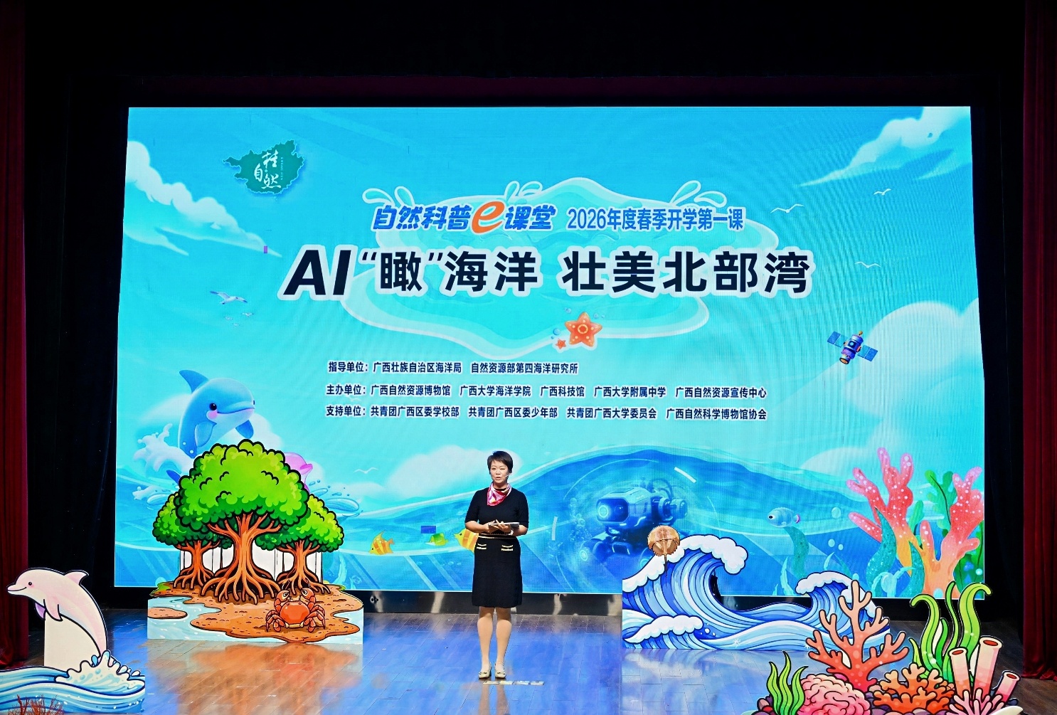 3月11日下午,一场充满“AI味儿”的“自然科普e课堂——春季开学第一课”在伟德国际唯一官网老员工活动中心剧场精彩上演。此次活动由广西壮族自治区海洋局、自然资源部第四海洋研究所指导,在共青团广西区委公司部、少年部,共青团伟德国际唯一官网委员会,广西自然科学博物馆协会等单位的支持下,公司联合广西自然资源博物馆、广西科技馆、伟德国际唯一官网附属公司、广西自然资源宣传中心等单位主办,以“AI‘瞰’海洋 壮美北部湾”为主题,通过线上线下联动开展海洋科普。全区超300所中小公司组织师生集中收看,活动同步走进西藏、浙江两地,各平台共计在线人数51万余人,让蓝色生态文明理念跨越地域、广泛传播。