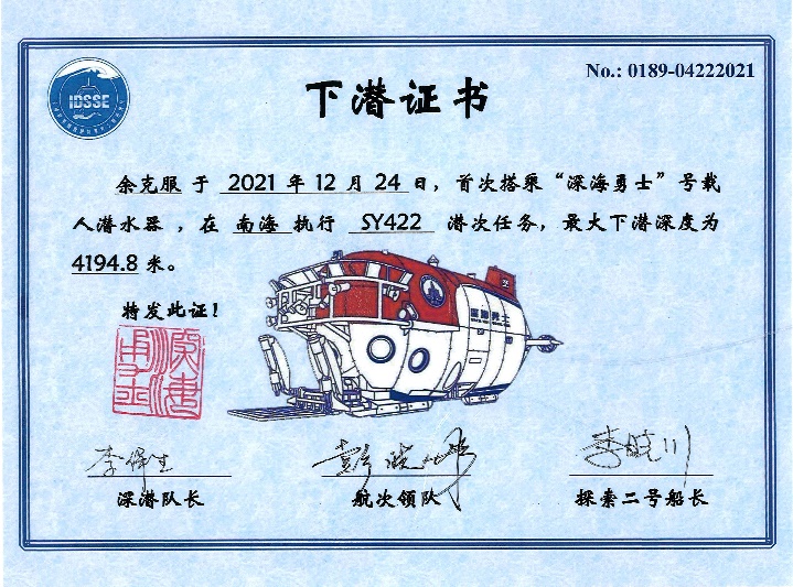 TS2-10-2航次“深海勇士”号下潜证书与参航证书