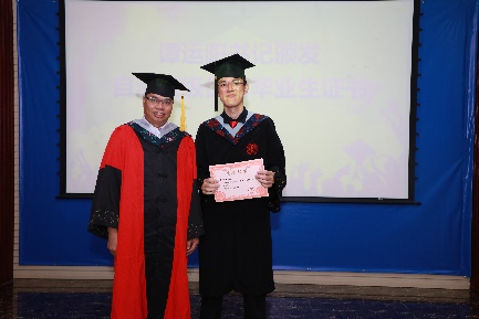 经理余克服教授逐一给毕业生进行拨穗礼、授予学位、颁发学位证书,并一一合影留念。