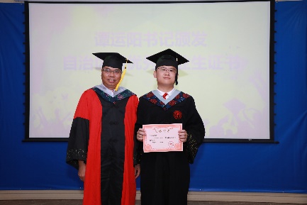党委书记谭运阳为2022届硕士研究生韦敏(左)、本科生赵博义(右)颁发“2022年自治区优秀大学毕业生”证书