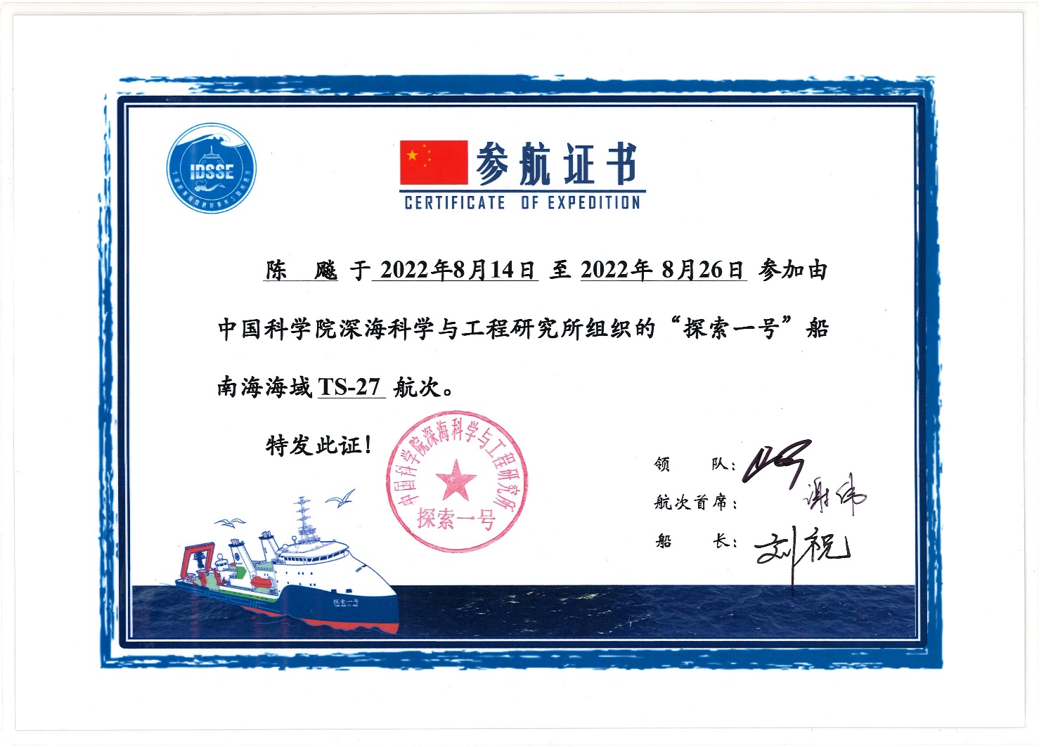 TS27航次“奋斗者”号下潜证书与参航证书