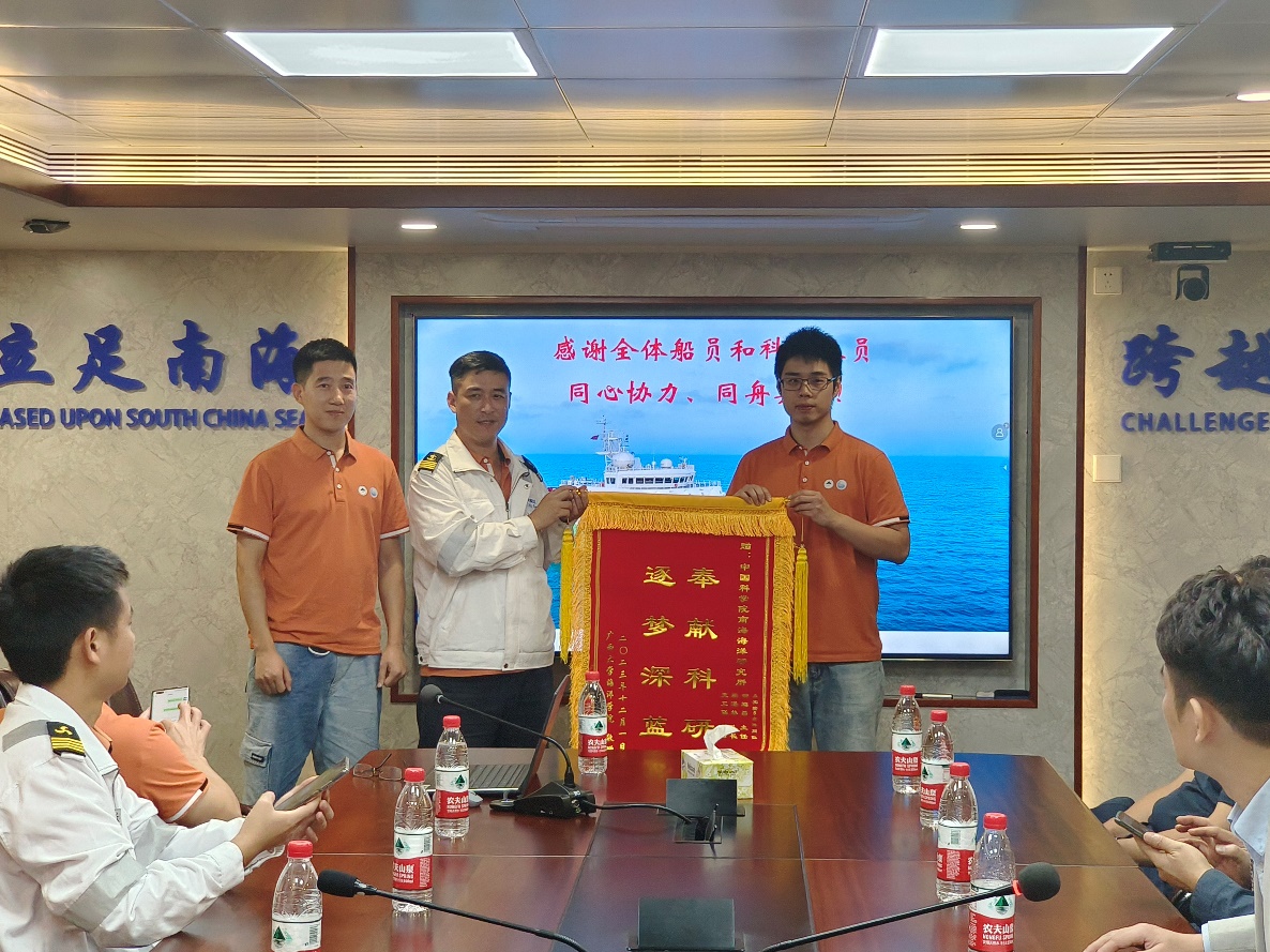 “蓝色梦想”科考队员向中国科公司海洋研究所及“科学号”科考船全体队员赠送锦旗
