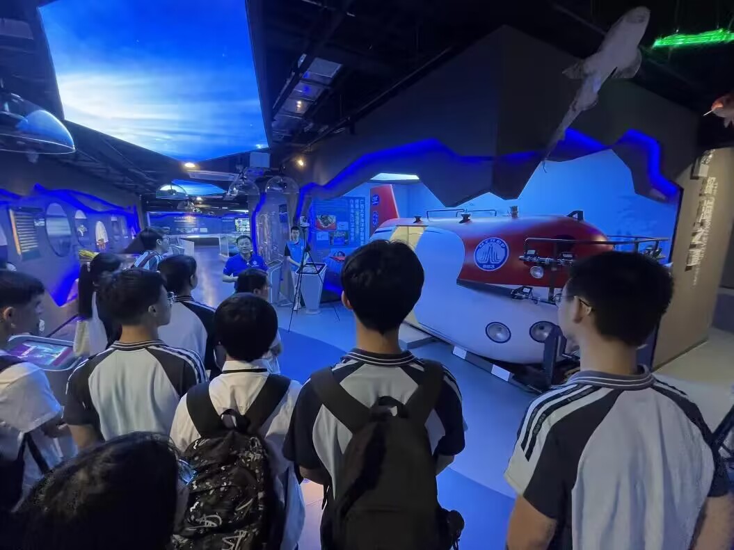 在“蔚蓝之境”展厅,李老师首先向同学们讲述了全球海洋的形成过程、海水的性质和运动、海底地形类型等基础知识,并聚焦全球范围内珊瑚礁的分布和生长现状;在“海洋之魅”展厅,李老师向同学们介绍了三类重要的海洋生态系统——红树林、海草床、珊瑚礁,同学们进一步了解了不同海洋生态系统间的协同作用,及对维持全球生态系统稳定性的重要贡献。紧接着,在“研海之行”、“探海之道”、“筑梦之基”展厅中,同学们不但观赏到了各类海洋生物标本,还通过丰富的图文资料,对我国南海岛礁的保护性开发成果有了进一步的认识。