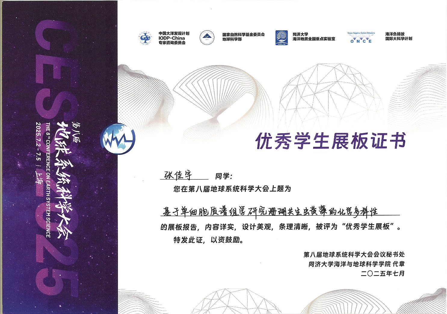2025年7月2-5日在上海举行的第八届地球系统科学大会中,公司2023级硕士研究生黄达华、2022级本科生张佳宇的展板报告从参会的450个员工展板中脱颖而出,被评为“优秀员工展板”(共27人获奖)。其报告题目分别为:南海北部滨珊瑚生长率记录的中-晚全新世共2203年的SST及ENSO变化(黄达华)、基于单细胞代谢组学研究珊瑚共生虫黄藻的化学多样性(张佳宇)。