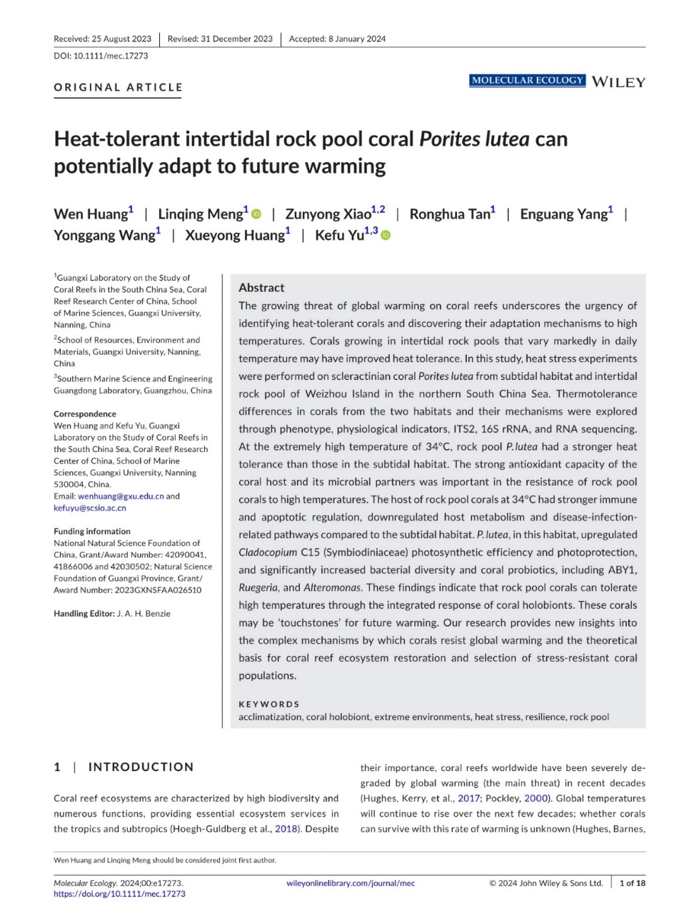 Huang Wen, Meng Linqing, Xiao Zunyong, Tan Ronghua, Yang Enguang, Wang Yonggang, Huang Xueyong, Yu Kefu. 2024. Heat-tolerant intertidal rock pool coral Porites lutea can potentially adapt to future warming. Molecular Ecology, 00, e17273. https://doi.org/10.1111/mec.17273