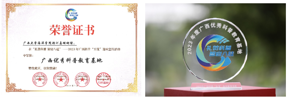 On January 17th, in the award ceremony of "Salute to Popular Science and Smart Start Bagui - 2023 Guangxi Popular Science 'Five Excellent' Selection and Publicity Activity" held in Guangxi Science and Technology Museum, Weizhou Coral Museum of School of Marine Sciences was selected as one of the "Top Ten Excellent Science Education Bases". Coral Museum of Weizhou Island was selected as one of the "Top Ten Excellent Science Education Bases". The organizing committee awarded the Weizhou Coral Museum of School of Marine Sciences with the following words of praise: "With a sincere heart, we go to the "Shanhai". As the largest coral museum in China, and the first scientific research and popularization venue with the theme of coral reefs, "planting" coral in the vast ocean provides a more vast practical platform for coral reef scientific research and popularization services-Build a Strong Marine Economy.