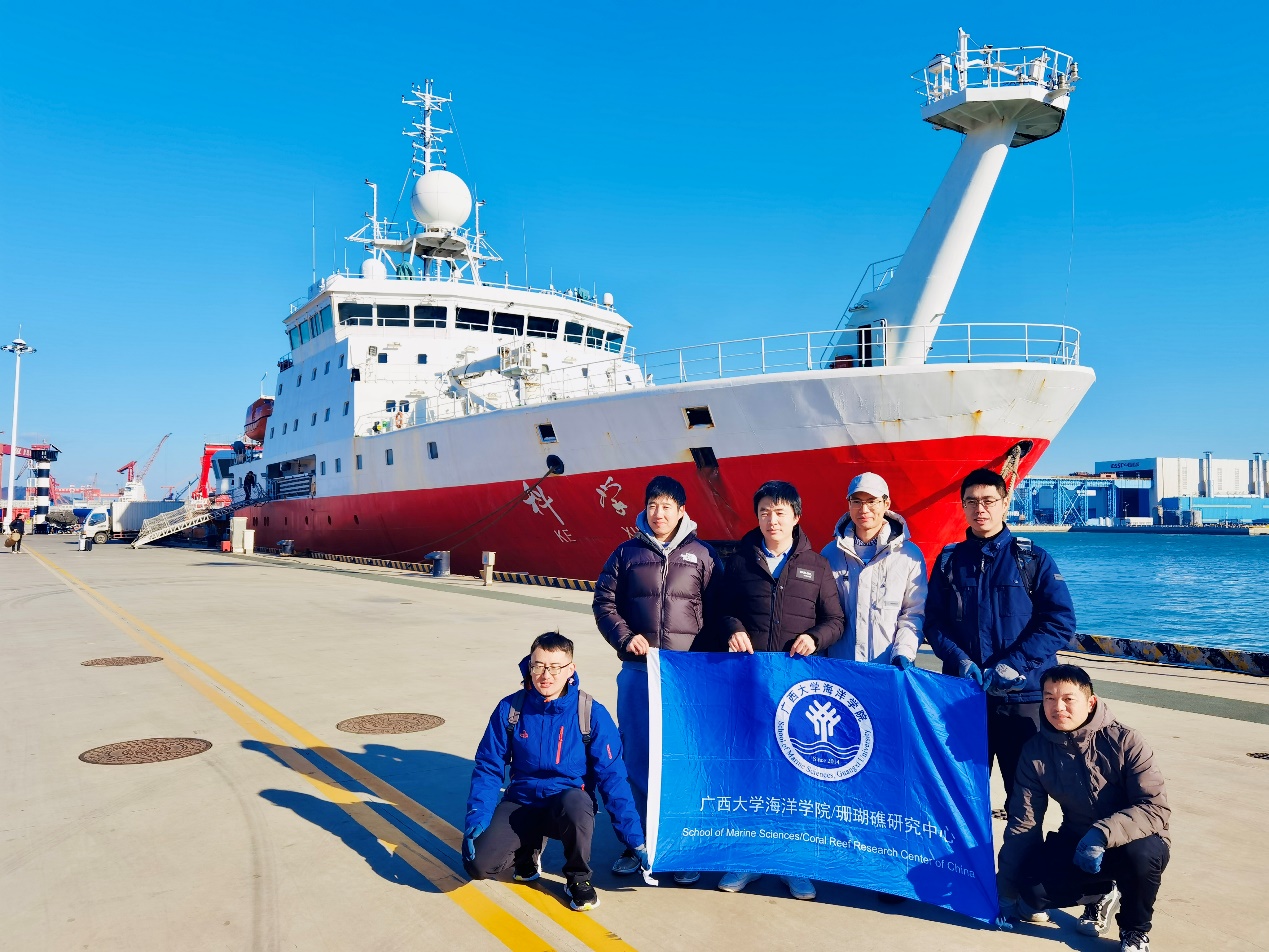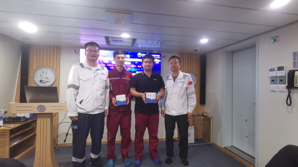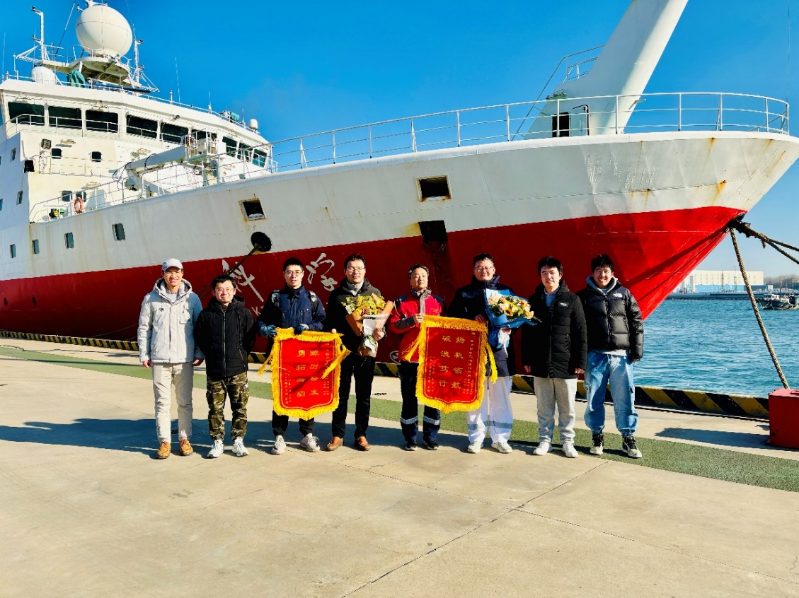 The team members of "Blue Dream" presented banners to the Institute of Oceanology of the Chinese Academy of Sciences and all the team members of the "Kexue" scientific expedition vessel